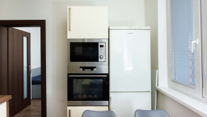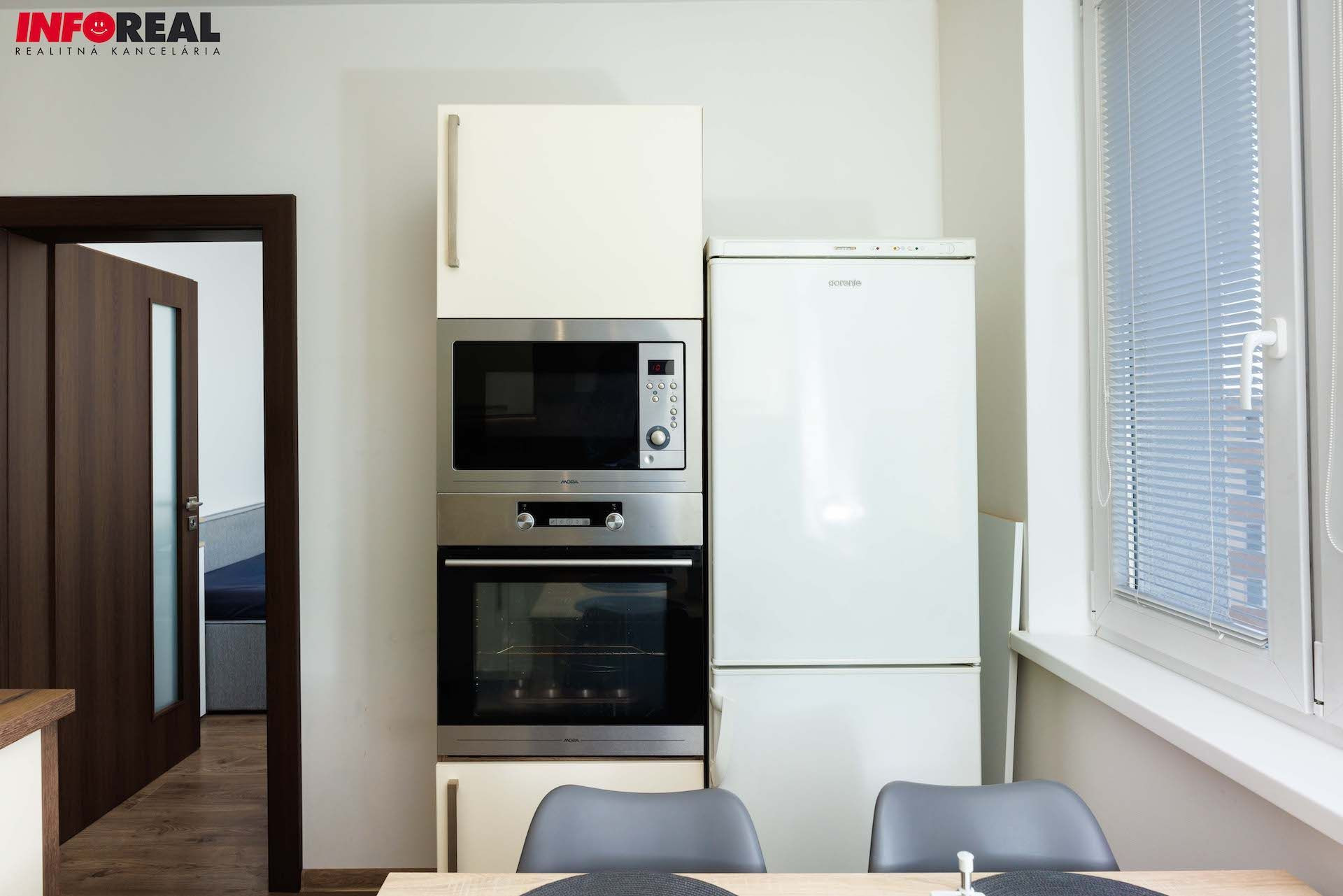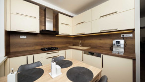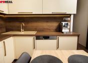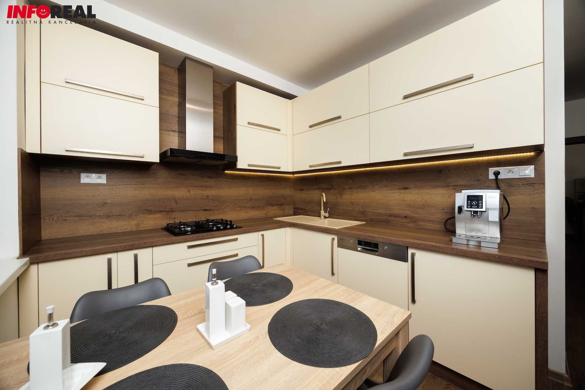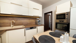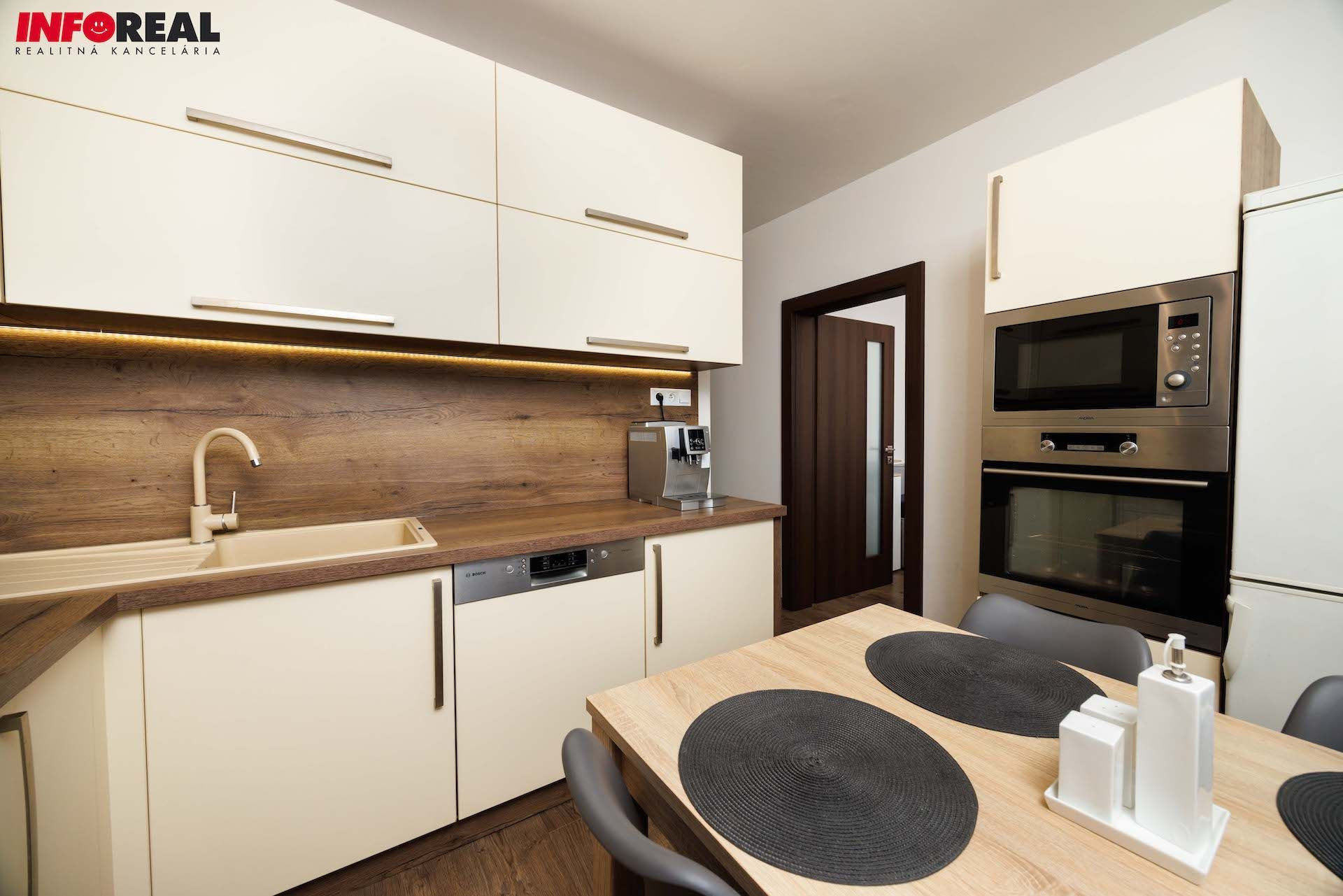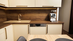 - kuchynská linka na mieru s integrovanými spotrebičmi (plynová varná doska, digestor, el. rúra, mikrovnka, umývačka riadu), kameninové umývadlo s batériou, samostatne stojaca chladnička