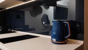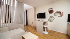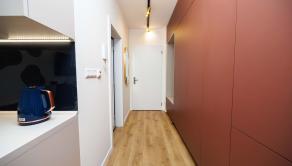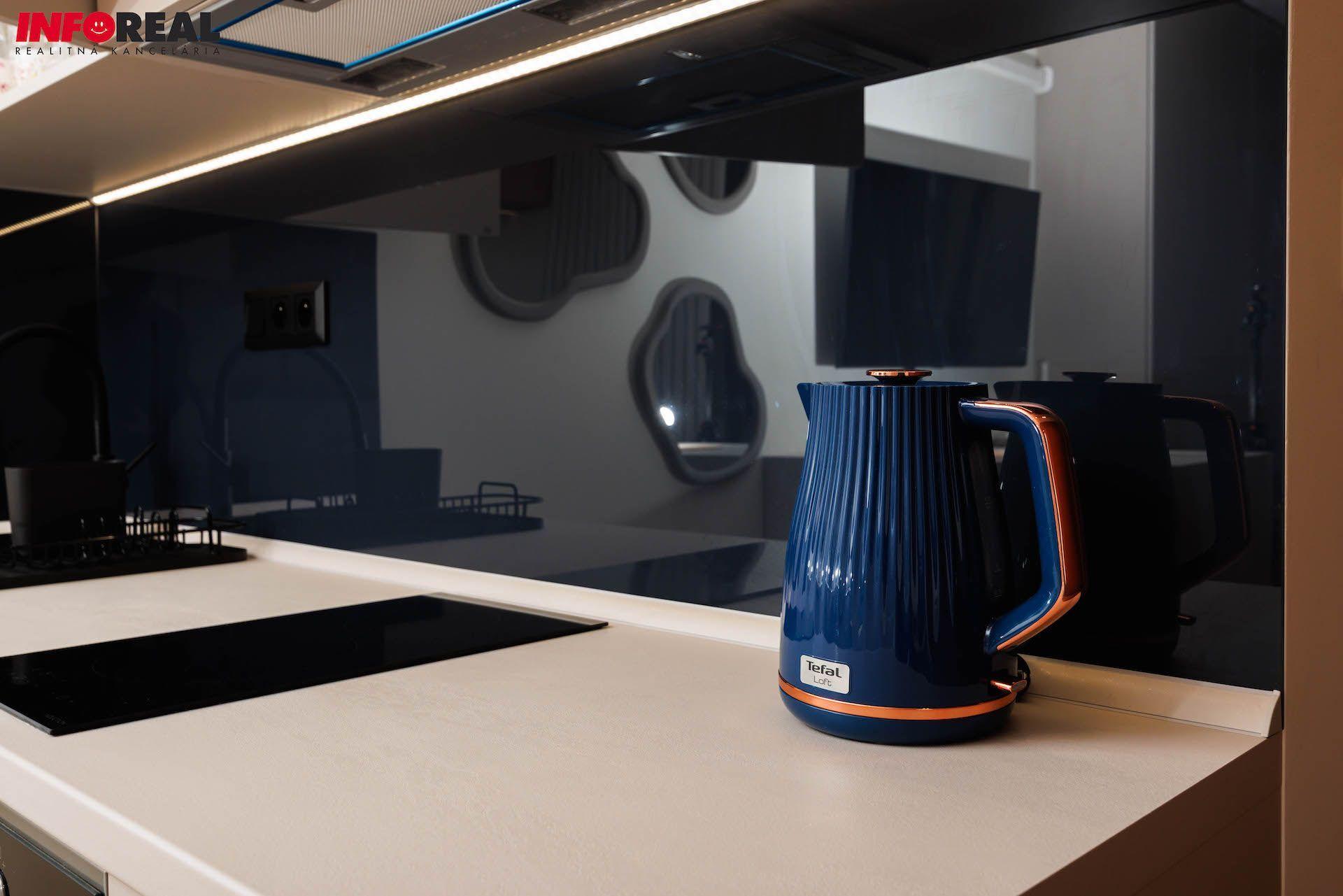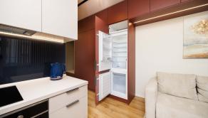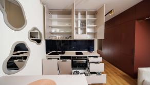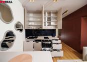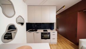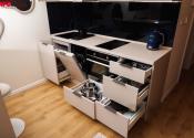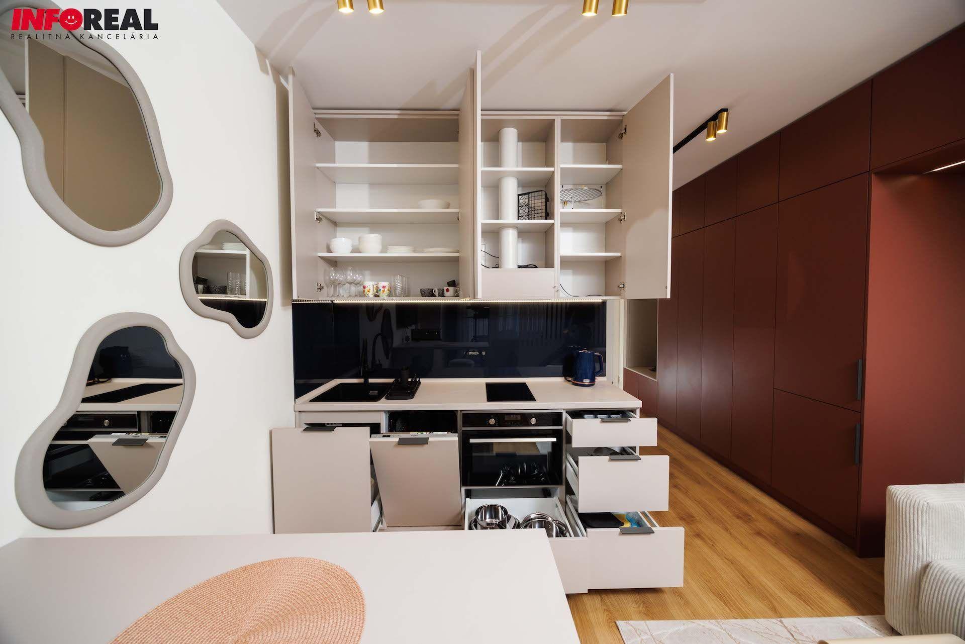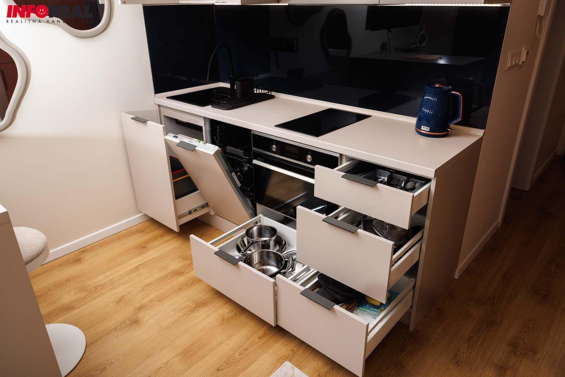 - Kuchyňa na mieru so vstavanými spotrebičmi: indukčná varná doska, elektrická rúra s mikrovlnkou, umývačka riadu, chladnička s mrazničkou, kompletné vybavenie kuchyne