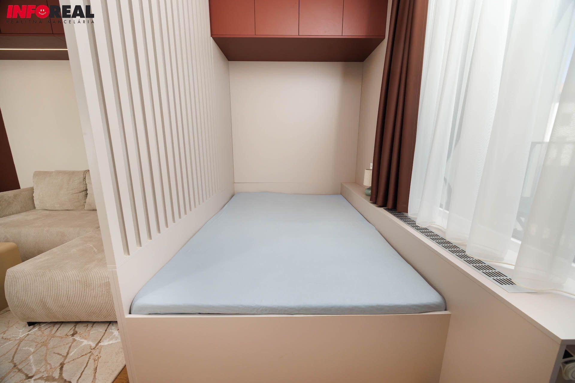Dispozícia je premyslená do detailov – vstupná chodba so vstavaným nábytkom, kúpeľňa s toaletou a veľkorysá hlavná miestnosť s kuchynským a spacím kútom. Každý centimeter priestoru je funkčne využitý vďaka nábytku na mieru.