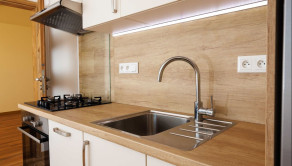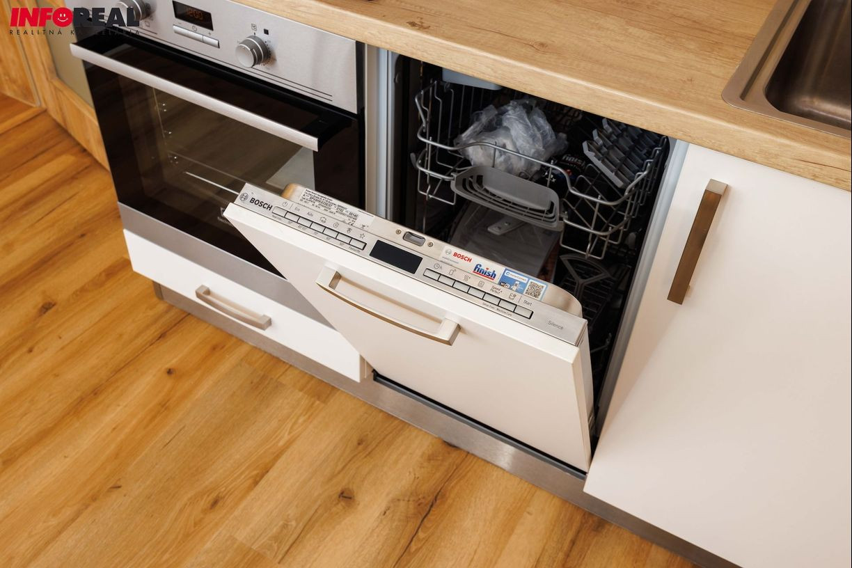 - Plne vybavená kuchyňa: plynová varná doska, elektrická rúra, digestor, umývačka riadu, chladnička s mrazničkou.
