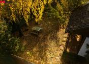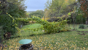 Záhrada je udržiavaná, s ovocnými stromami a viničom.