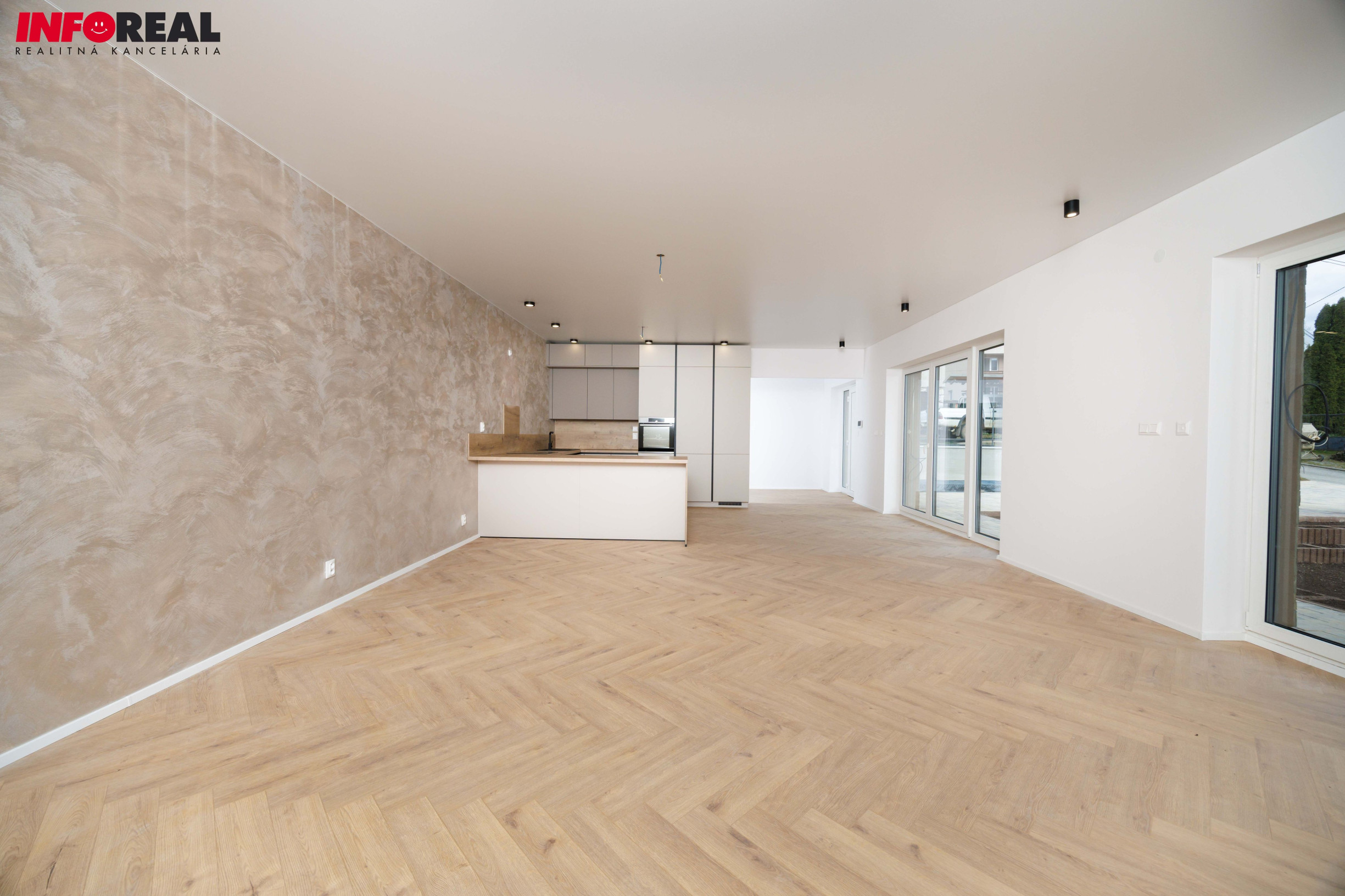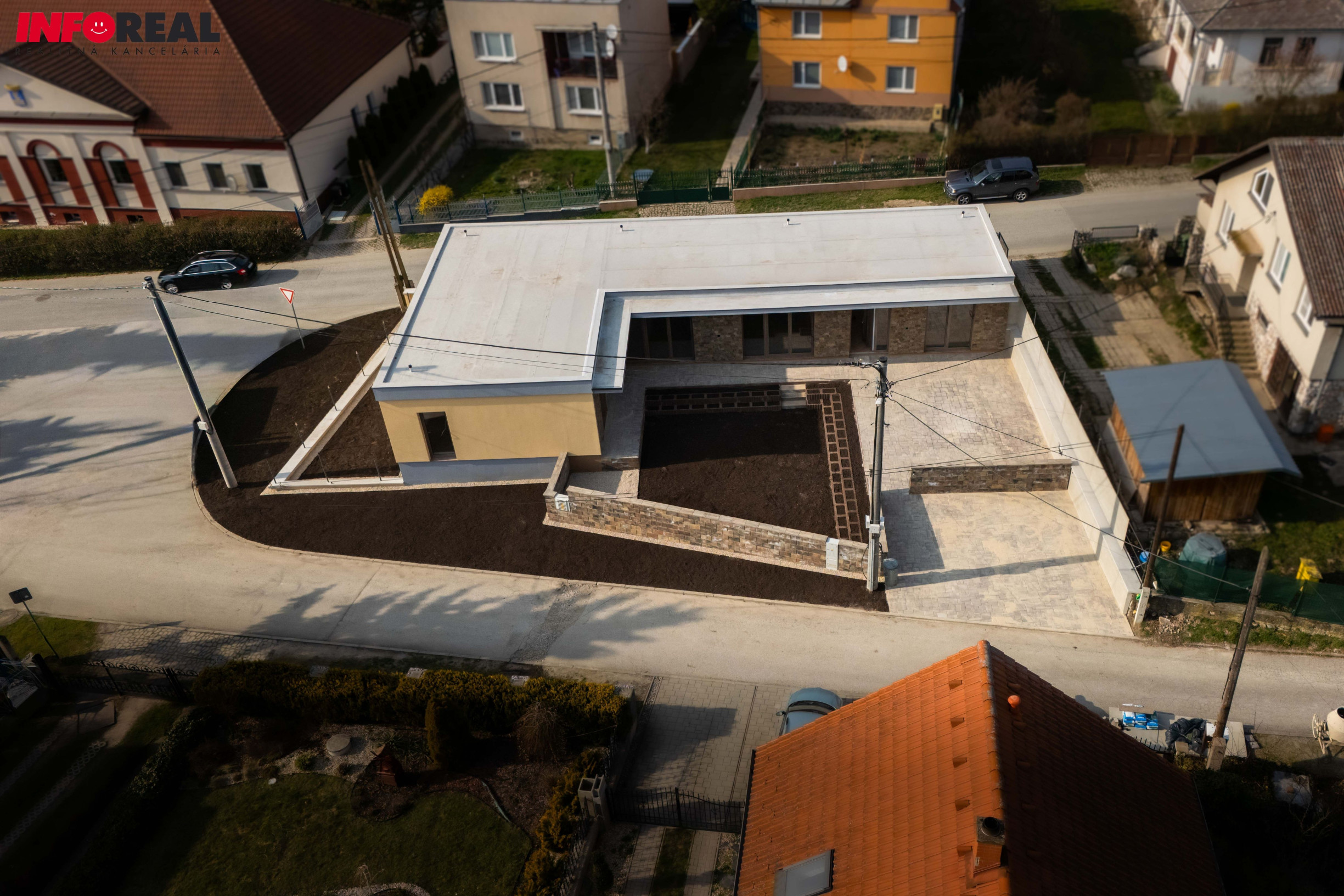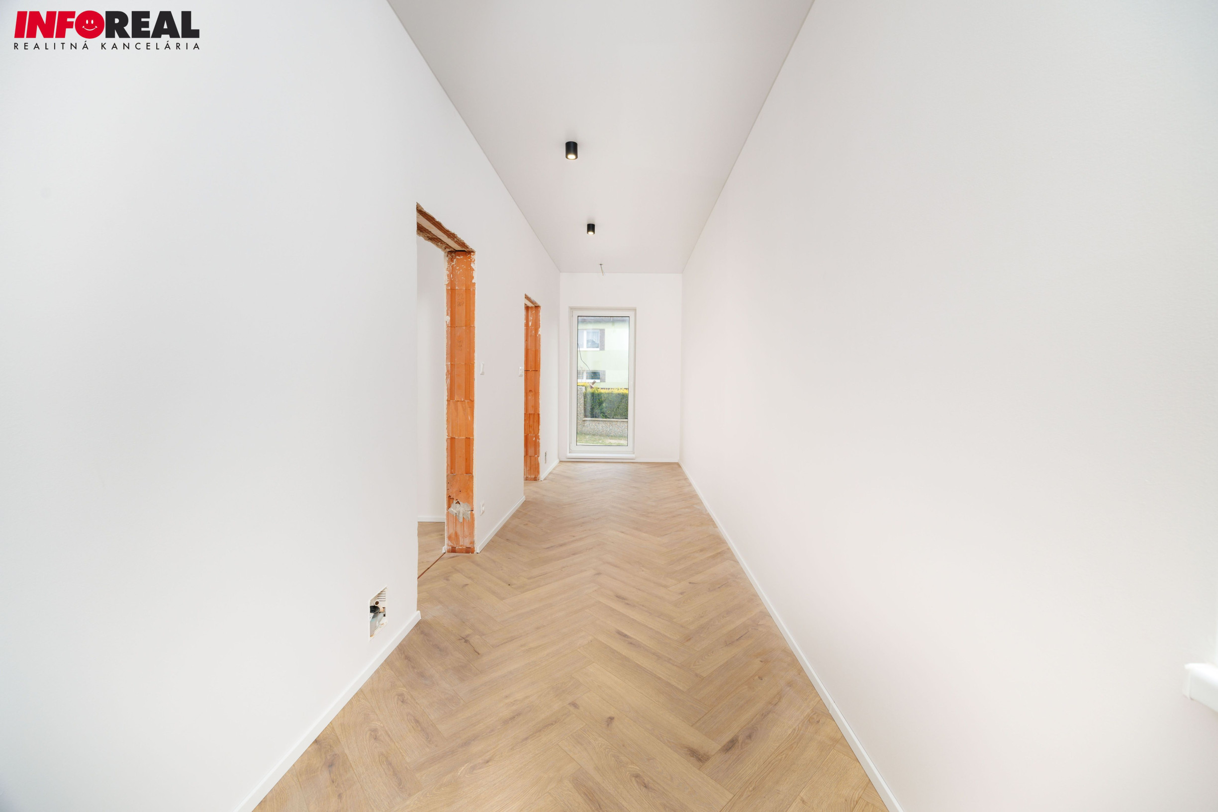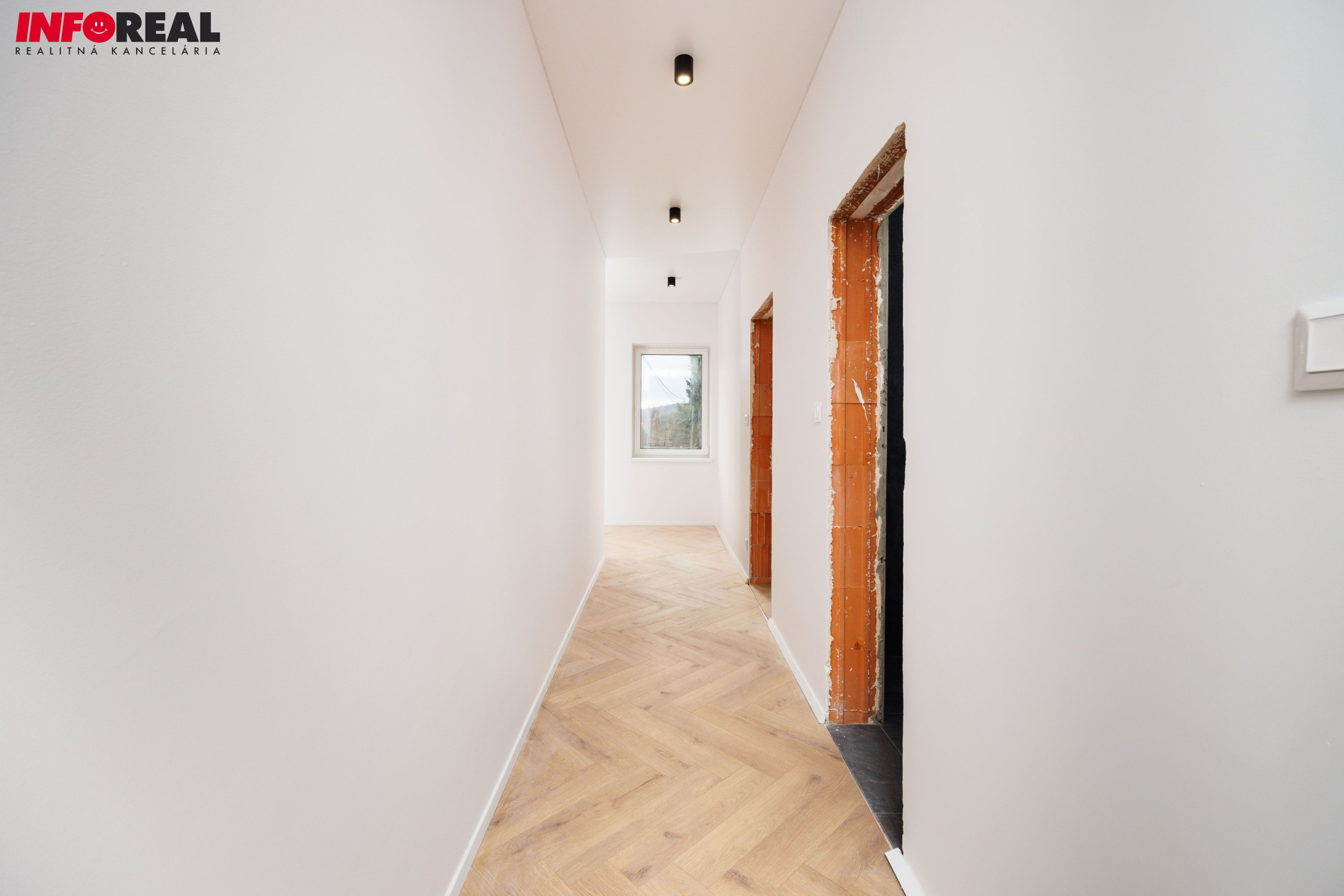 • Interiér: Kompletne dokončené podlahy (kvalitný laminát), interiérové dvere so zárubňami a moderné napínacie stropy v celom dome, ktoré dodávajú priestoru luxusný a čistý vzhľad.