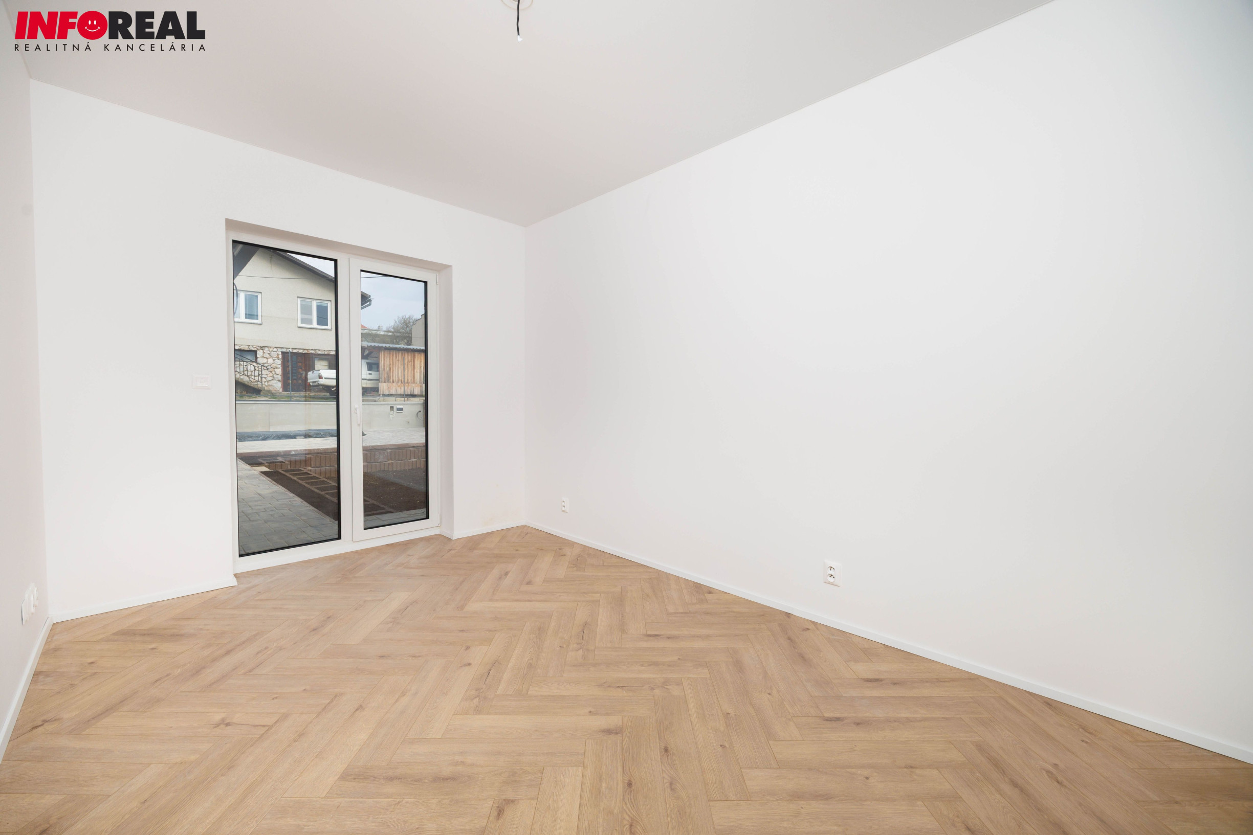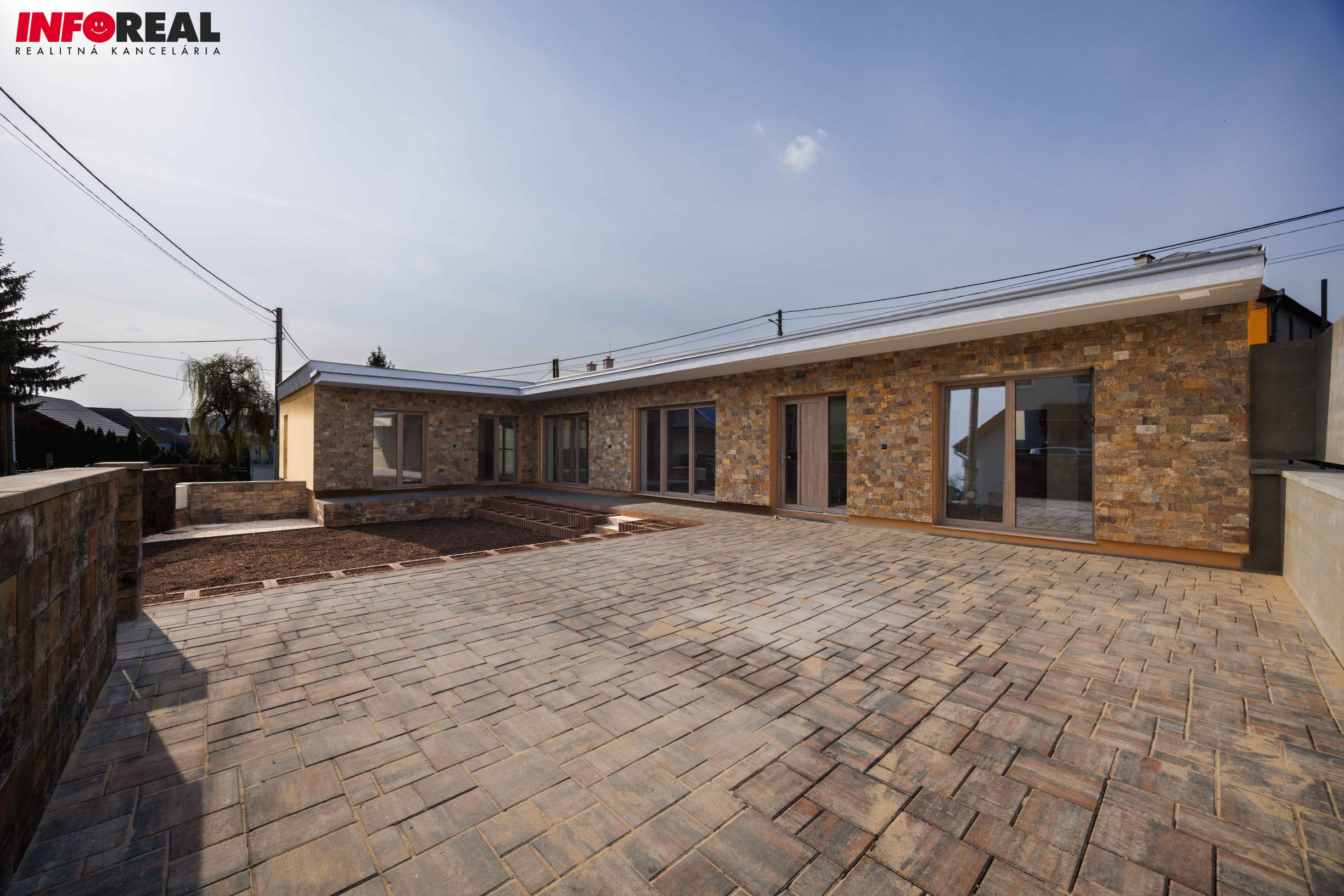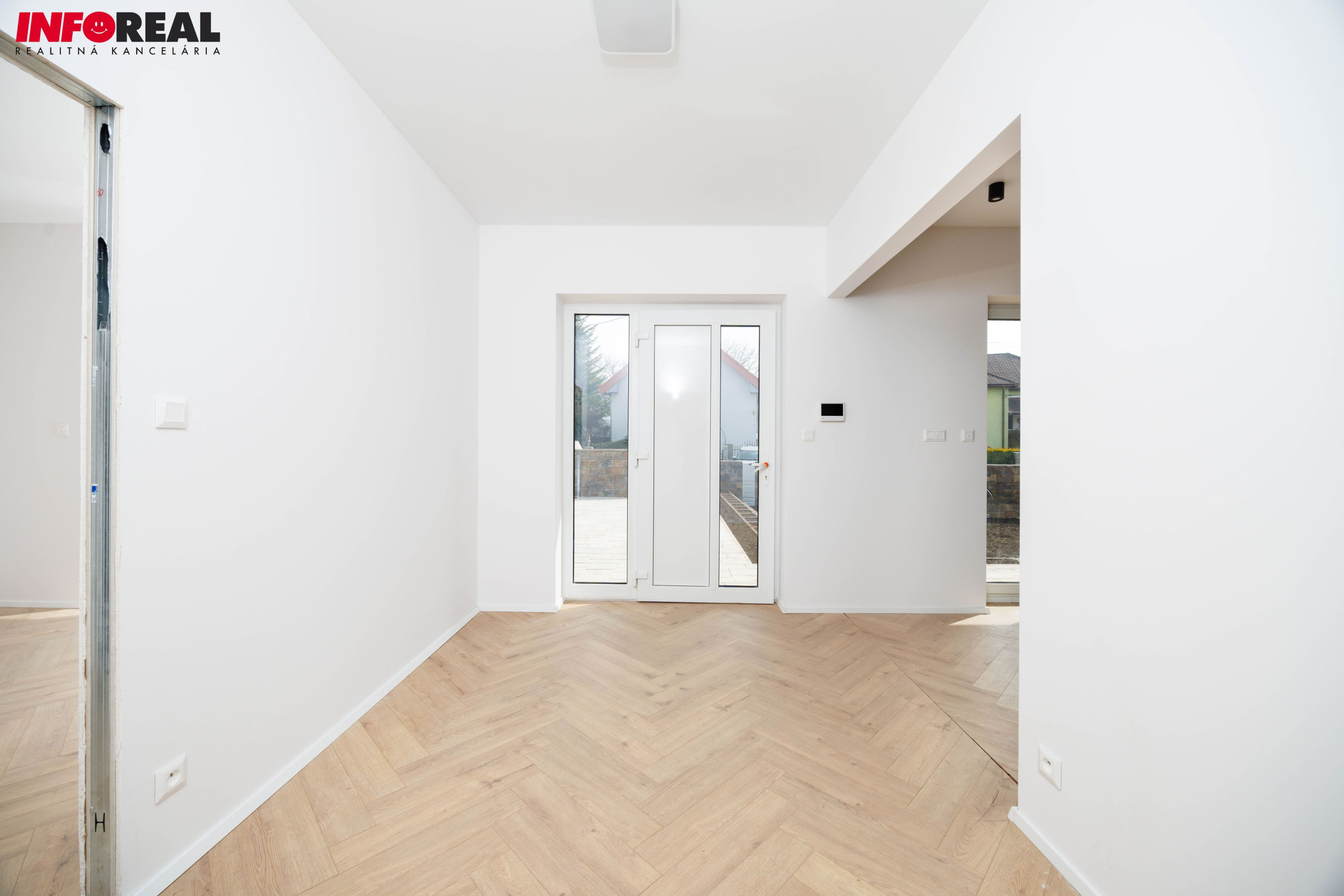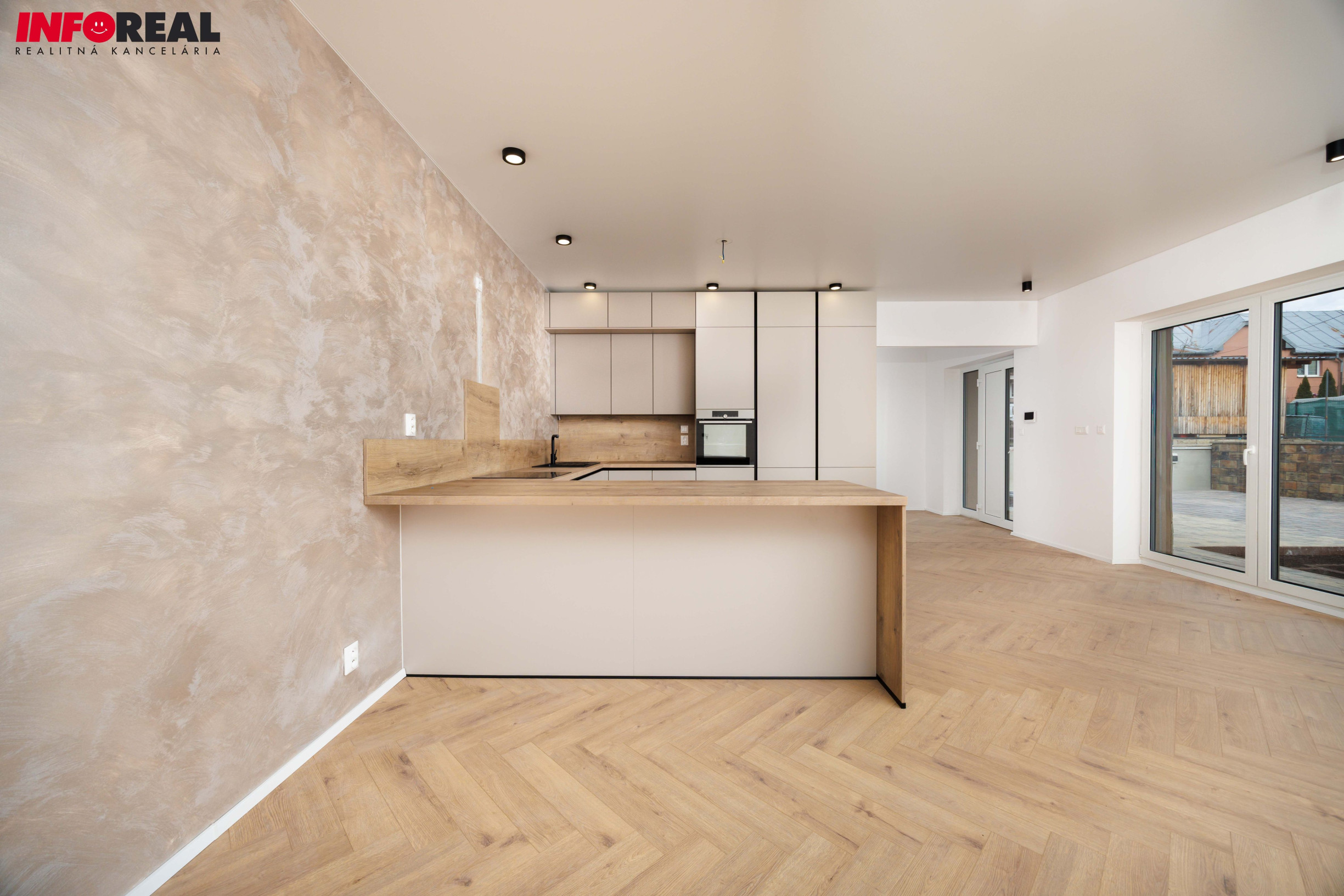 • Interiér: Kompletne dokončené podlahy (kvalitný laminát), interiérové dvere so zárubňami a moderné napínacie stropy v celom dome, ktoré dodávajú priestoru luxusný a čistý vzhľad.