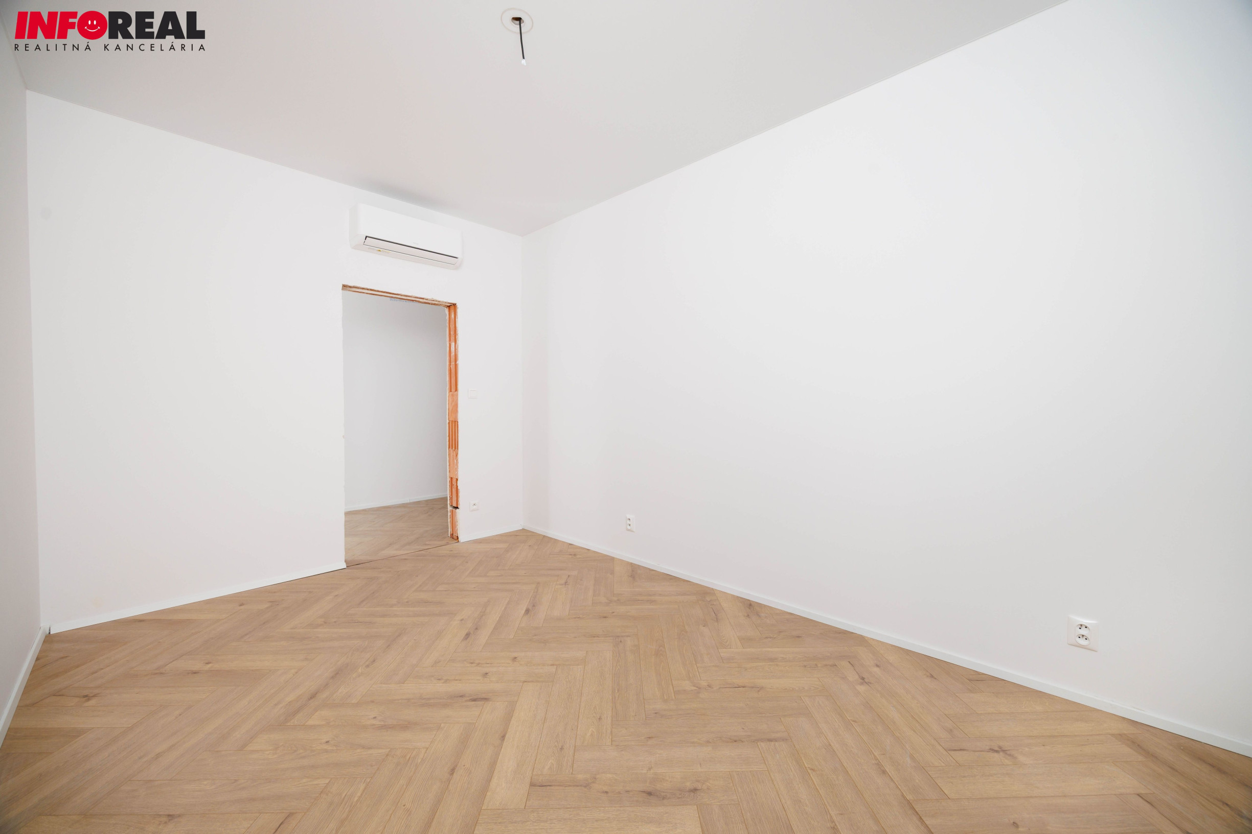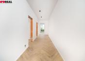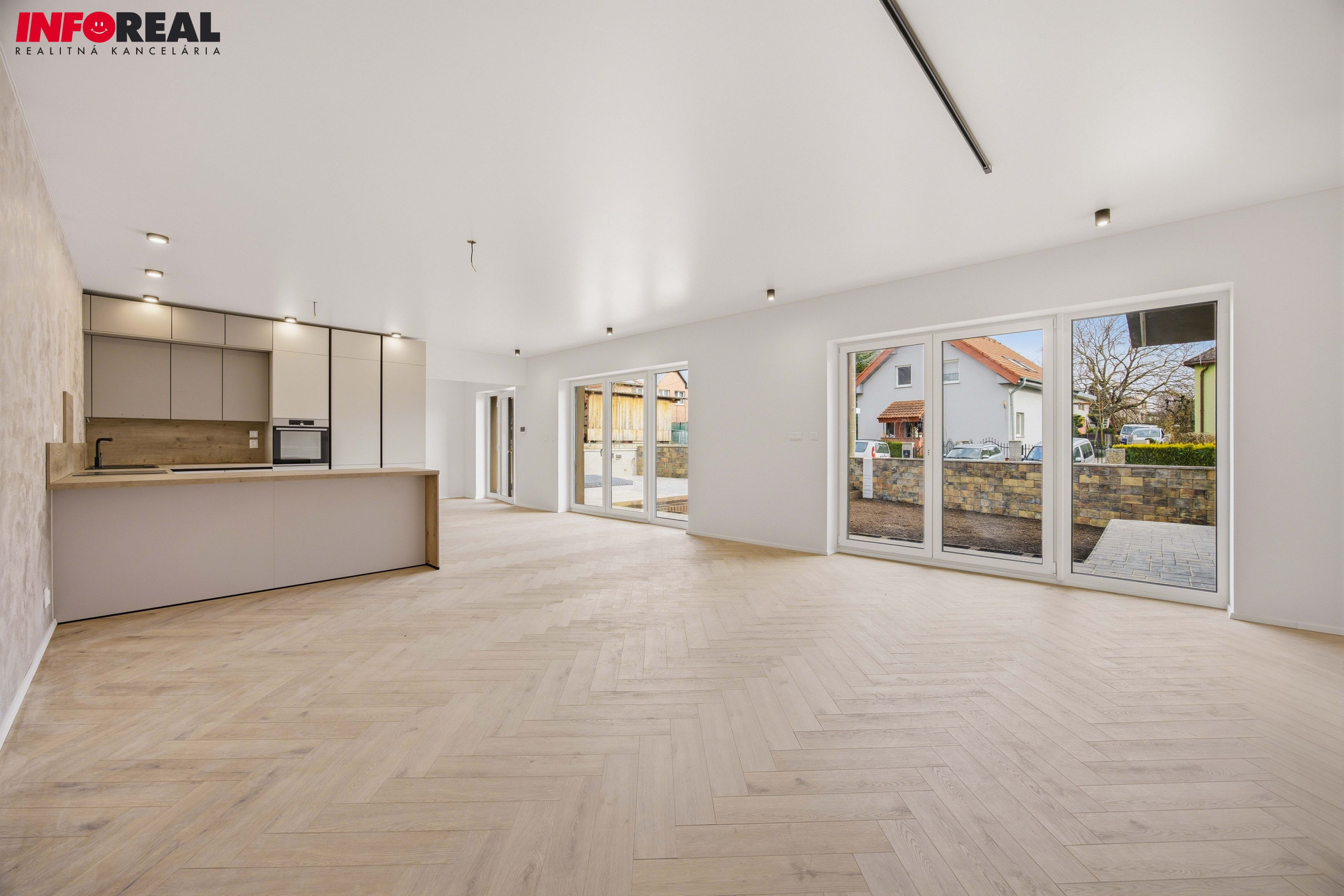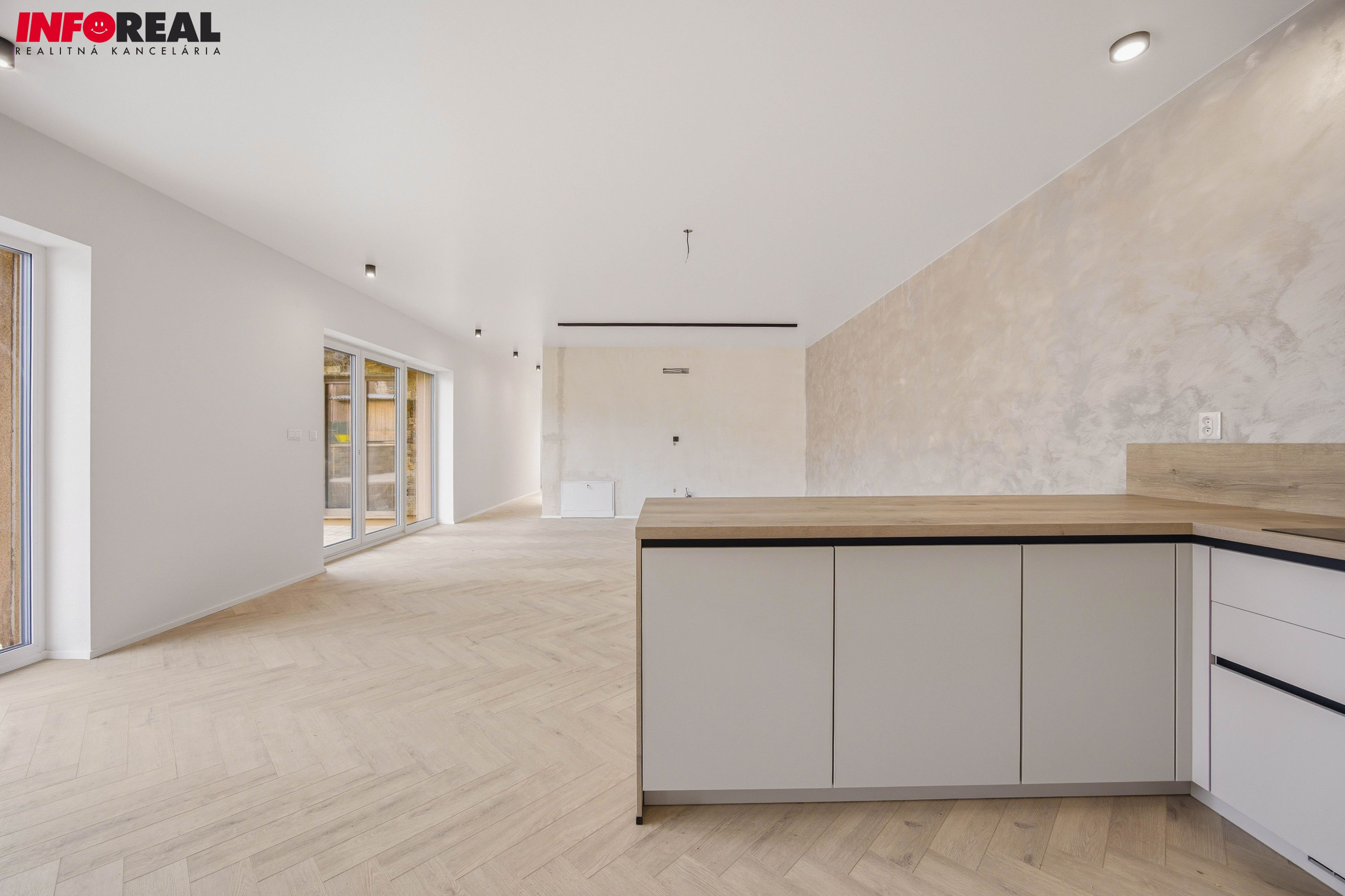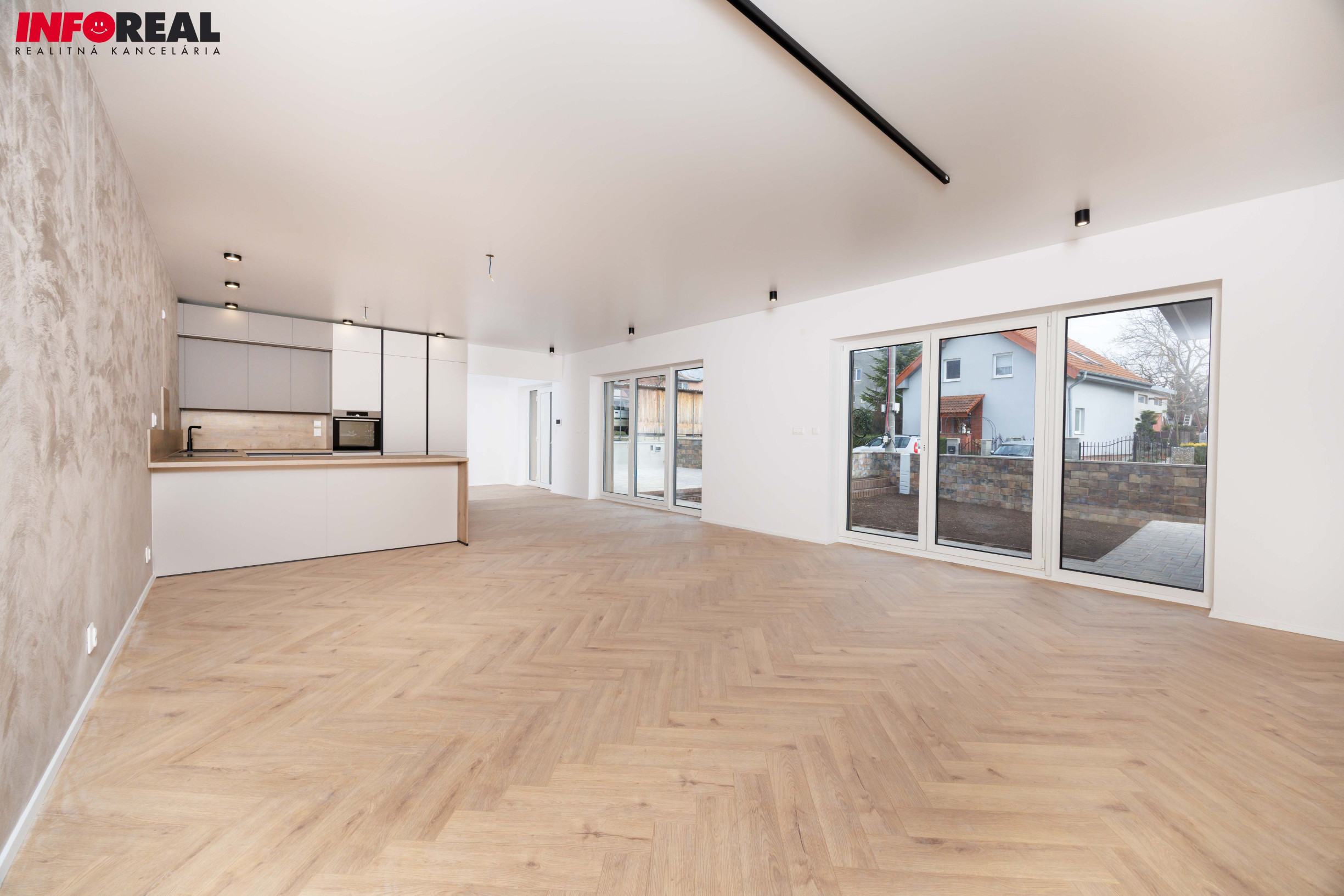 • Interiér: Kompletne dokončené podlahy (kvalitný laminát), interiérové dvere so zárubňami a moderné napínacie stropy v celom dome, ktoré dodávajú priestoru luxusný a čistý vzhľad.