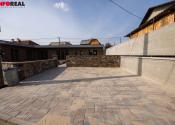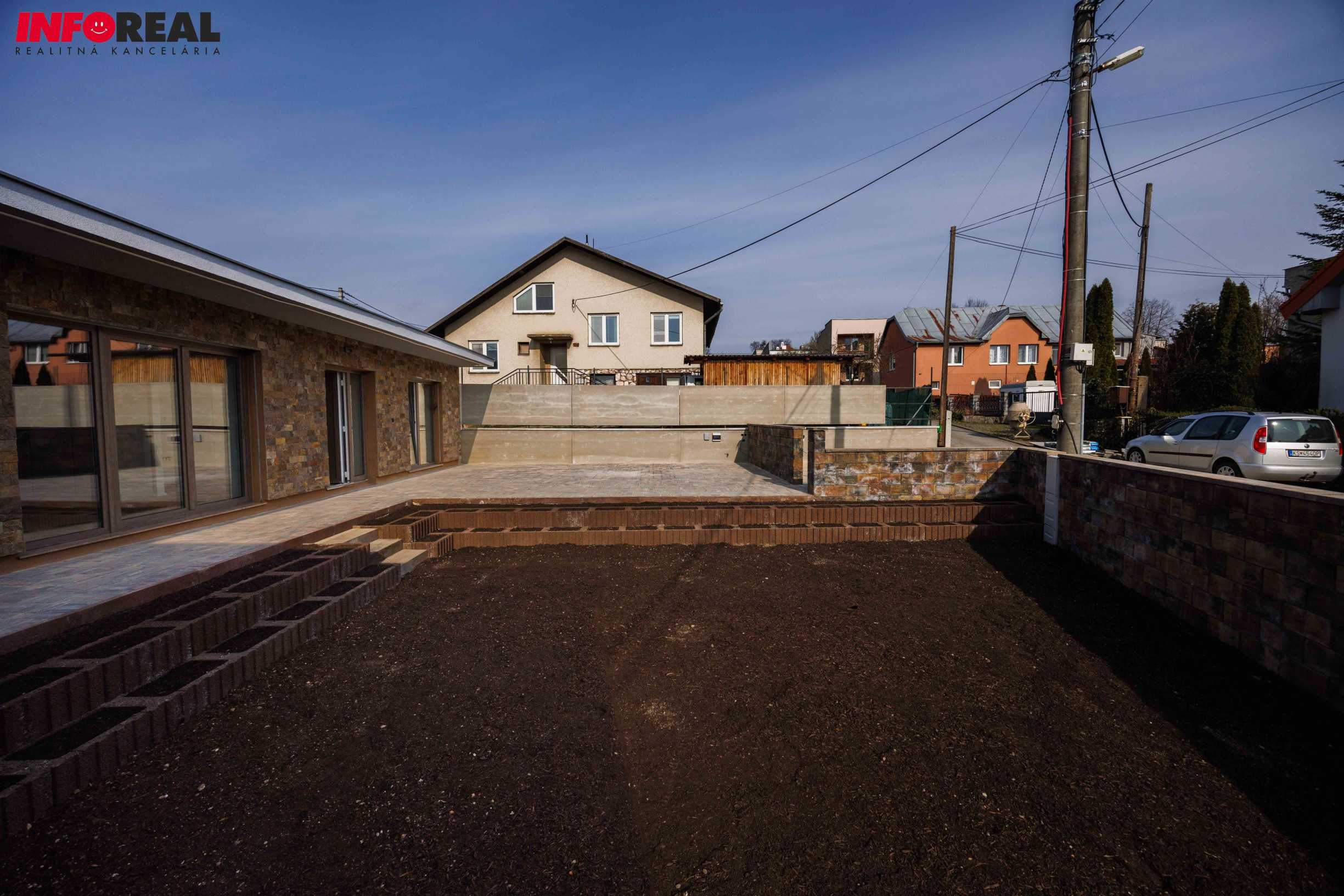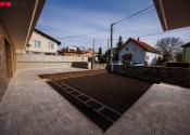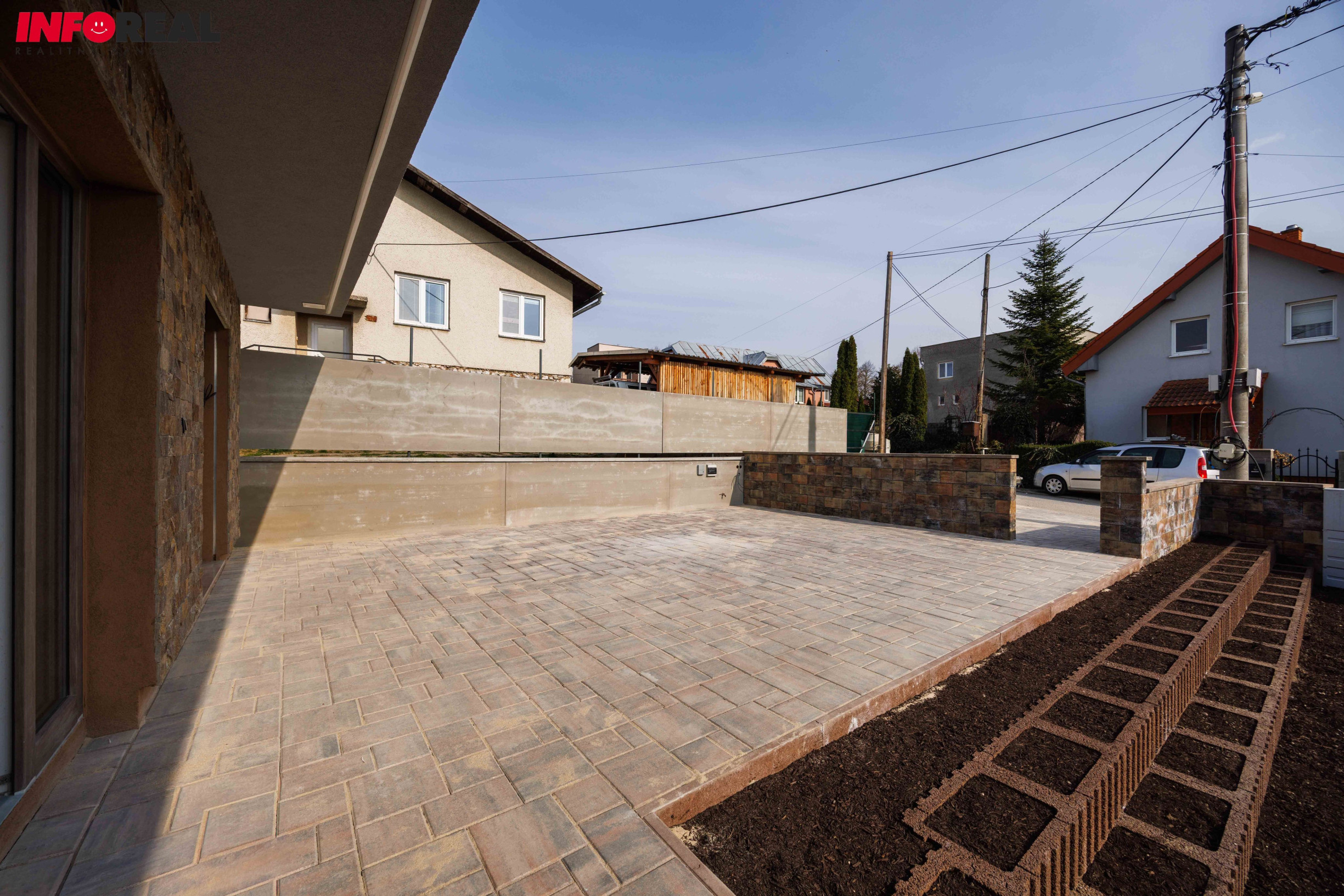 • Exteriér: Veľkorysá terasa s upraveným pozemkom a integrovanom závlahou trávnika.